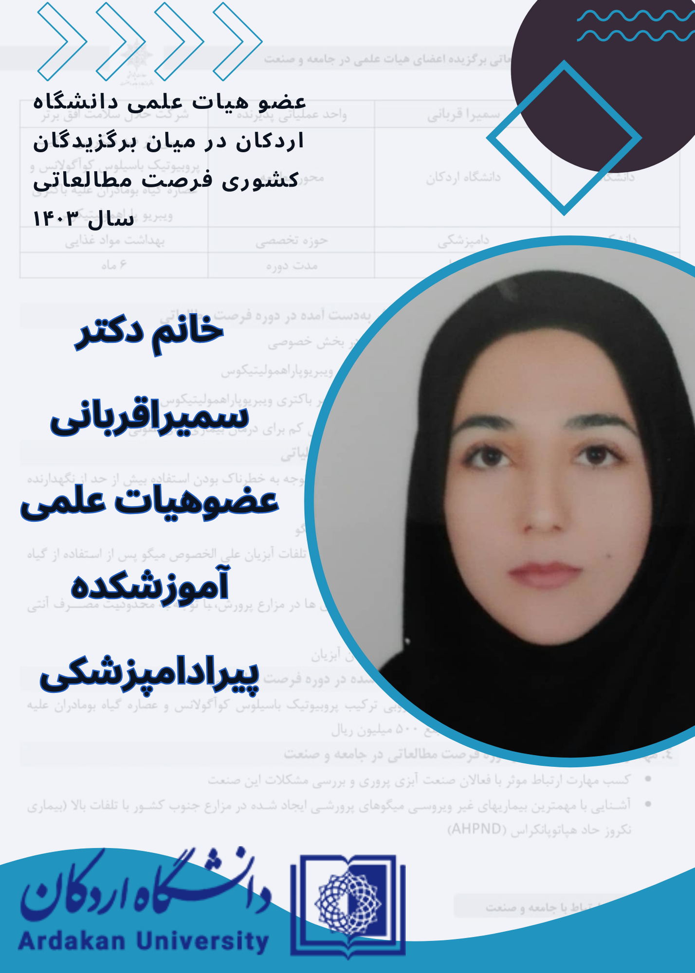 In this collection, the research fellowship of Dr. Samira Ghorbani, a faculty member at the School of Veterinary Paramedicine, titled “Investigation of the Antimicrobial Effect of the Probiotic Bacillus coagulans Combination and Yarrow Plant Extract against Vibrio parahaemolyticus Bacteria,” has been introduced as a selected research fellowship.